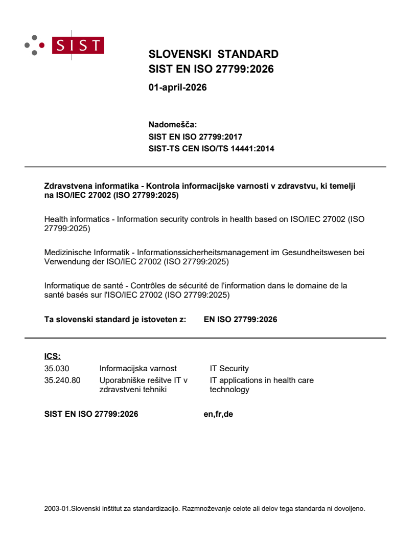 EN ISO 27799:2026 is a standard published by the European Committee for Standardization (CEN). Its full title is "Health informatics - Information security controls in health based on ISO/IEC 27002 (ISO 27799:2025)". This standard covers: This document provides information security controls, including implementation guidance, for health organizations. It is based on ISO/IEC 27002:2022 In addition to generic ICT equipment and software used in many other environments, the scope of this document includes software and systems specifically for healthcare, such as electronic health record systems and medical devices incorporating health software. Such medical devices can be programmed or programmable and can contain software, firmware or both. Other digital equipment (such as that for environmental and infection control, building management, and physical security), which can be used in premises where healthcare is provided, is also in scope. This document applies to information in all its aspects, whatever form the information takes (including text and numbers, sound recordings, drawings, images and video), by whatever means it has been acquired or captured, whatever means are used to store it (such as printing or writing on paper or storage electronically), and whatever means are used to transfer or exchange it (orally, by hand, by post, movement of storage media, direct links or networking). This document is for organizations of all types and sizes that provide healthcare or are custodians of personal health information for other reasons. The information that they are responsible for can be stored and processed in many possible ways and locations, including on premises or in the cloud, but remains in scope. This document applies to all physical settings where healthcare is intended to be delivered, such as hospitals, clinics and other locations or facilities designated for healthcare purposes such as ambulances and mobile imaging or diagnostic units. It also applies to care provided elsewhere, such as in residential premises. In addition to the range of settings, this document applies to all methods of service provision including remote or virtual healthcare.