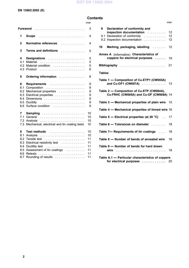 ..17Table 6 — Tolerances on diameter ........18Table 7— Requirements of tin coatings ....18Table 8 — Number of bends of annealed wire 18Table 9 — Number of bends for hard drawn wire ...........................18Table A.1 — Particular characteristics of coppers for electrical purposes .............202SIST EN 13602:2004