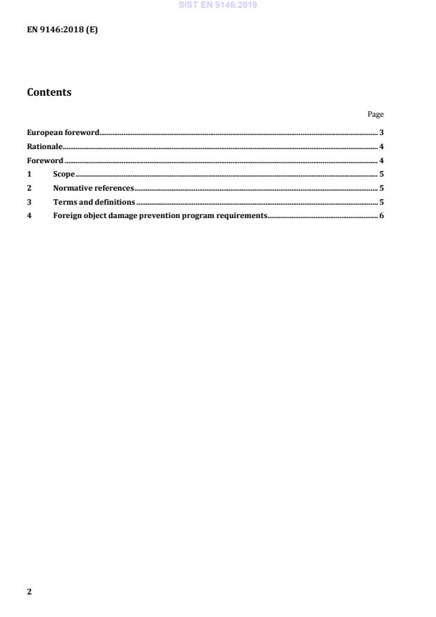 EN 9146:2018 is a standard published by the European Committee for Standardization (CEN). Its full title is "Aerospace series - Foreign Object Damage (FOD) Prevention Program - Requirements for Aviation, Space, and Defence Organizations". This standard covers: This European standard defines FOD Prevention Program requirements for organizations that design, develop, and provide aviation, space, and defence products and services; and by organizations providing post-delivery support, including the provision of maintenance, spare parts, or materials for their own products and services. It is emphasized that the requirements specified in this European standard are complementary (not alternative) to customer, and applicable statutory and regulatory requirements. Should there be a conflict between the requirements of this standard and applicable statutory or regulatory requirements, the latter shall take precedence.