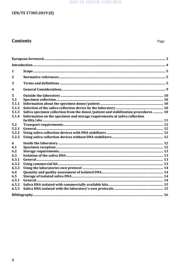CEN/TS 17305:2019 is a technical specification published by the European Committee for Standardization (CEN). Its full title is "Molecular in vitro diagnostic examinations - Specifications for pre-examination processes for saliva - Isolated human DNA". This standard covers: This document gives requirements on the handling, storage, processing and documentation of saliva specimens intended for human DNA examination during the pre-examination phase before a molecular examination is performed. This document is applicable to molecular in vitro diagnostic examination including laboratory developed tests performed by medical laboratories. It is also intended to be used by laboratory customers, in vitro diagnostics developers and manufacturers, biobanks, institutions and commercial organisations performing biomedical research, and regulatory authorities. Dedicated measures that need to be taken for saliva collected on absorbing material or by mouth washes are not described in this technical specification. Neither are measures for preserving and handling of native saliva cell-free DNA, pathogens, and other bacterial or whole microbiome DNA in saliva described. NOTE International, national or regional regulations or requirements can also apply to specific topics covered in this document.