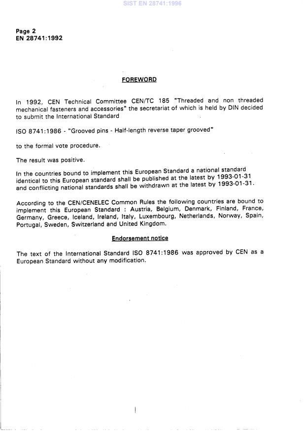EN 28741:1992 is a standard published by the European Committee for Standardization (CEN). Its full title is "Grooved pins - Half-length reverse taper grooved (ISO 8741:1986)". This standard covers: Grooved pins - Half-length reverse taper grooved (ISO 8741:1986)
