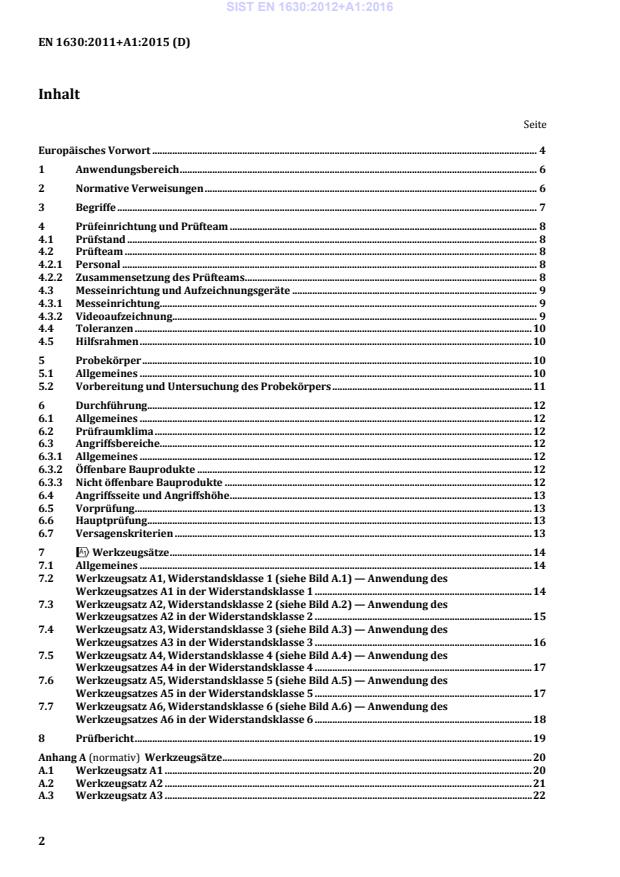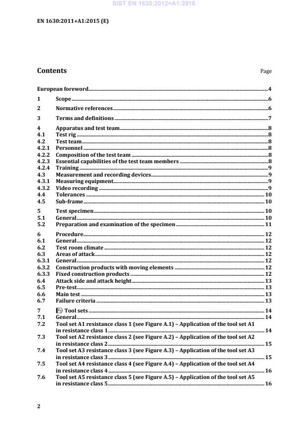 European foreword .4 1 Scope .6 2 Normative references .6 3 Terms and definitions .7 4 Apparatus and test team .8 4.1 Test rig .8 4.2 Test team .8 4.2.1 Personnel .8 4.2.2 Composition of the test team .8 4.2.3 Essential capabilities of the test team members .8 4.2.4 Training .9 4.3 Measurement and recording devices .9 4.3.1 Measuring equipment.9 4.3.2 Video recording .9 4.4 Tolerances . 10 4.5 Sub-frame . 10 5 Test specimen . 10 5.1 General . 10 5.2 Preparation and examination of the specimen . 11 6 Procedure . 12 6.1 General . 12 6.2 Test room climate . 12 6.3 Areas of attack . 12 6.3.1 General . 12 6.3.2 Construction products with moving elements . 12 6.3.3 Fixed construction products . 12 6.4 Attack side and attack height . 13 6.5 Pre-test . 13 6.6 Main test . 13 6.7 Failure criteria . 13 7 !Tool sets . 14 7.1 General . 14 7.2 Tool set A1 resistance class 1 (see Figure A.1) – Application of the tool set A1 in resistance class 1 . 14 7.3 Tool set A2 resistance class 2 (see Figure A.2) – Application of the tool set A2 in resistance class 2 . 15 7.4 Tool set A3 resistance class 3 (see Figure A.3) – Application of the tool set A3 in resistance class 3 . 15 7.5 Tool set A4 resistance class 4 (see Figure A.4) – Application of the tool set A4 in resistance class 4 . 16 7.6 Tool set A5 resistance class 5 (see Figure A.5) – Application of the tool set A5 in resistance class 5 . 16 SIST EN 1630:2012+A1:2016
