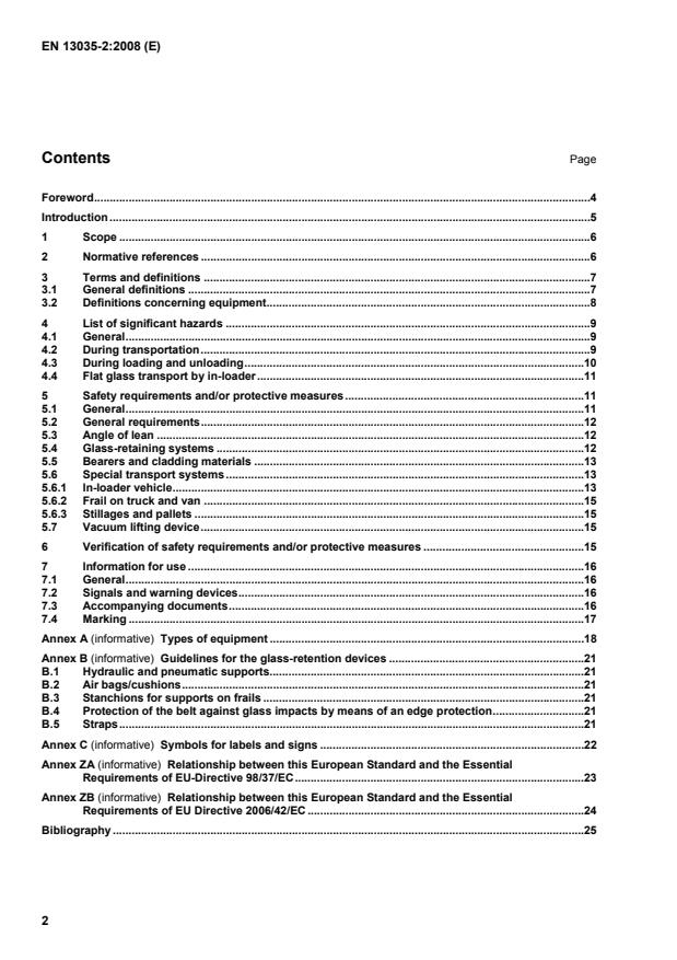 EN 13035-2:2008 is a standard published by the European Committee for Standardization (CEN). Its full title is "Machines and plants for the manufacture, treatment and processing of flat glass - Safety requirements - Part 2: Storage, handling and transportation equipment outside the factory". This standard covers: 1.1 This standard contains the requirements for safety for the design and installation of equipment intended for the storage (as defined in 3.2.1), handling (as defined in 3.2.2) and transportation (as defined in 3.2.3) of flat glass outside the factory (as defined in 3.1.1) and including stillages, pallets, frails fixed to vehicles, in-loader vehicles, specific glass-securing devices, stanchions and vacuum-lifting devices which are used for road transport and on building sites. 1.2 Specific hazards due to the use inside the factory are dealt with in EN 13035-1. 1.3 This standard deals only with the devices which are directly in contact with the glass. This standard does not apply to manual handling equipment such as carrying straps and vacuum pads. Tractors, cranes, hoists and fork lifts are out of the scope as well as parts of other powered vehicles that are not in contact with the glass. This European Standard does not apply to equipment for the transport by other ways than on road e.g. by ship or train, and the transportation of glazed windows/frames. 1.4 This standard deals with all significant hazards, hazardous situations and events relevant to equipment for the storage, handling and transportation of flat glass, when they are used as intended and under conditions of misuse which are reasonably foreseeable by the manufacturer (see Clause 4). This standard specifies the appropriate technical measures to eliminate or reduce risks arising from the significant hazards during commissioning, the operation and maintenance. Noise has not been considered to be a significant hazard for any type of equipment in the scope of this standard. 1.5 This document is not applicable to storage, handling or transportation equipment for flat glass outside the factory, which is manufactured before the date of its publication as EN.
