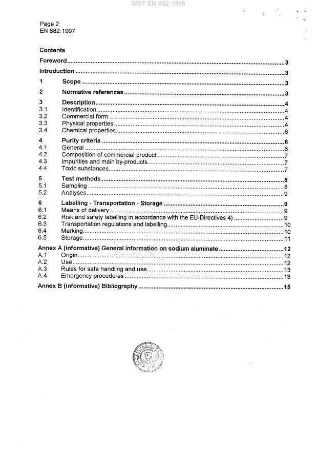 EN 882:1997 is a standard published by the European Committee for Standardization (CEN). Its full title is "Chemicals used for treatment of water intended for human consumption - Sodium aluminate". This standard covers: This European Standard describes the characteristics and specifies the requirements of sodium aluminate used for treatment of water intended for human consumption and gives reference to the analytical methods. It gives information on its use in water treatment.