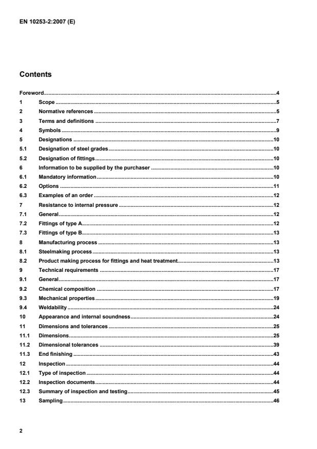 EN 10253-2:2007 is a standard published by the European Committee for Standardization (CEN). Its full title is "Butt-welding pipe fittings - Part 2: Non alloy and ferritic alloy steels with specific inspection requirements". This standard covers: This Part of EN 10253 specifies the technical delivery requirements for seamless and welded butt welding fittings (elbows, concentric and eccentric reducers, equal and reducing tees, caps) made of carbon and alloy steel which are intended for pressure purposes at room temperature, at low temperature or at elevated temperatures, and for the transmission and distribution of fluids and gases. It specifies: - type of fittings ; - type A : Butt-welding fittings with reduced pressure factor ; - type B : Butt-welding fittings for use at full service pressure ; - steel grades ; - mechanical properties ; - dimensions and tolerances ; - requirements for inspection and testing ; - inspection documents ; - marking ; - protection and packaging. NOTE In the case of a harmonised supporting standard for materials, presumption of conformity to the ESRs is limited to technical data of materials in the standard and does not presume adequacy of the material to a specific item of equipment. Consequently it is essential that the technical data stated in the material standard be assessed against the design requirements of this specific item of equipment to verify that the ESRs of the PED are satisfied.