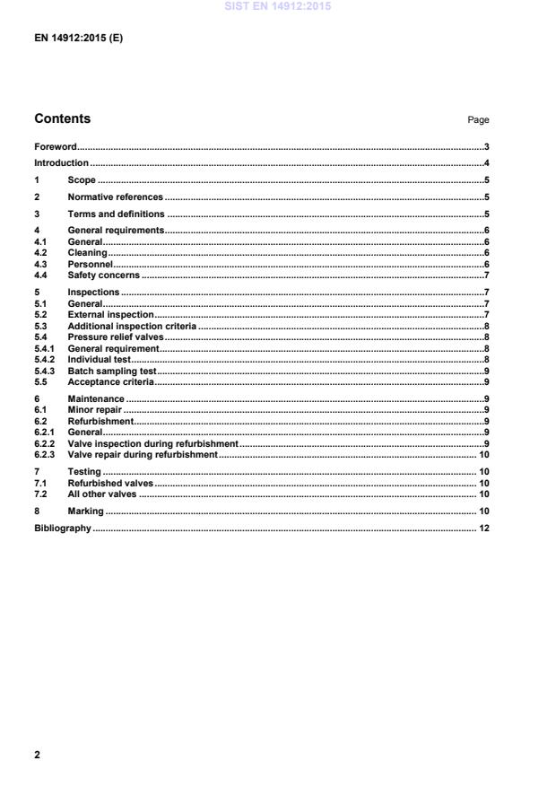 Foreword .3 Introduction .4 1 Scope .5 2 Normative references .5 3 Terms and definitions .5 4 General requirements .6 4.1 General .6 4.2 Cleaning .6 4.3 Personnel .6 4.4 Safety concerns .7 5 Inspections .7 5.1 General .7 5.2 External inspection .7 5.3 Additional inspection criteria .8 5.4 Pressure relief valves .8 5.4.1 General requirement .8 5.4.2 Individual test .8 5.4.3 Batch sampling test .9 5.5 Acceptance criteria .9 6 Maintenance .9 6.1 Minor repair .9 6.2 Refurbishment .9 6.2.1 General .9 6.2.2 Valve inspection during refurbishment .9 6.2.3 Valve repair during refurbishment . 10 7 Testing . 10 7.1 Refurbished valves . 10 7.2 All other valves . 10 8 Marking . 10 Bibliography . 12