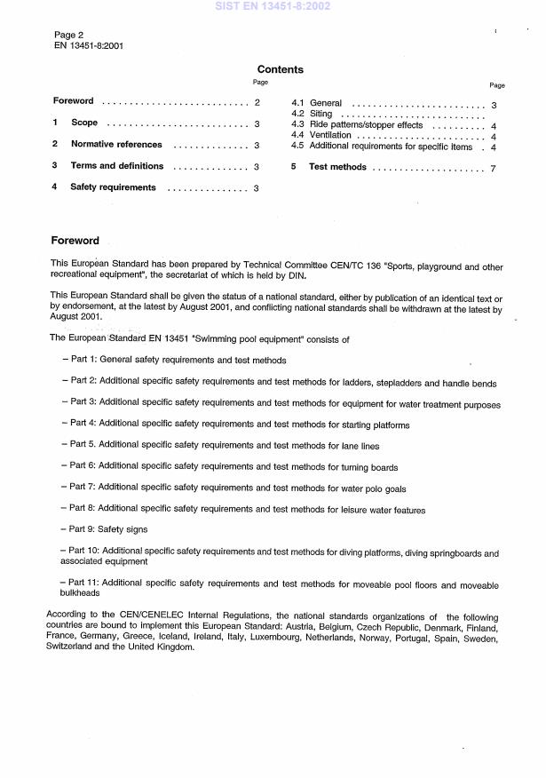 Dieser Teil der EN 13451 legt sicherheitstechnische Anforderungen für Freizeiteinrichtungen, Geräte und Effekte in Verbindung mit Wasser zusätzlich zu den allgemeinen sicherheitstechnischen Anforderungen nach EN 13451-1:2001 fest.