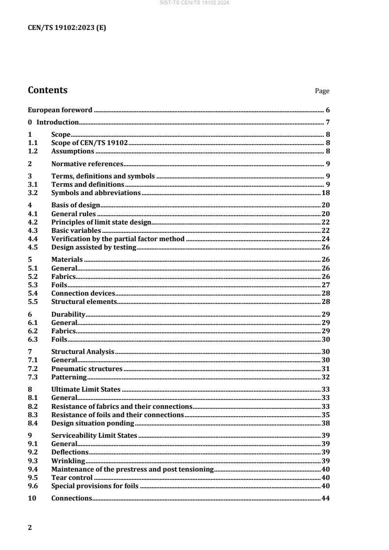 1.1 Scope of CEN/TS 19102 (1) This document applies to the design of buildings and structural works, made of structural membrane material. It provides guidance for the design of tensioned membrane structures, either mechanically or pneumatically tensioned at a defined prestress level. NOTE 1 Membrane materials comprise structural fabrics, coated structural fabrics and foils. NOTE 2 For elements of tensile surface structures not governed by this Technical Specification (for example made of steel, aluminium, wood or other structural materials), see relevant Eurocode parts. (2) This document is concerned with the requirements for resistance, serviceability and durability of tensioned membrane structures, as given in EN 1990. NOTE 1 The safety criteria follow EN 1990 and will consider specific limit states for tensioned membrane structures. NOTE 2 Specific requirements concerning seismic design are not considered. (3) Design and verification in this document is based on limit state design in conjunction with the partial factor method. NOTE Special attention goes to the action of prestress, snow, wind and rain action on membrane structures and the combined effect of wind and rain or snow. (4) This document covers analysis methodologies appropriate for tensioned membrane structures, from analytical to full numerical simulation methods. (5) This document considers connections between membrane materials and between membrane materials and others. (6) This document is applicable for hybrid membrane structures integrating different kinds of load bearing behaviour (tension, compression, bending, inflation…), in a way that the structural membrane shares loadbearing capacity with other structural elements made of different materials. NOTE The term ‘hybrid structure’ refers to this combined structural behaviour or use of materials. 1.2 Assumptions (1) The assumptions of EN 1990 apply to this document. (2) This document is intended to be used in conjunction with EN 1990, the EN 1991 series, the EN 1993 series, the EN 1999 series, ENs, EADs and ETAs for construction products relevant to tensioned membrane structures.