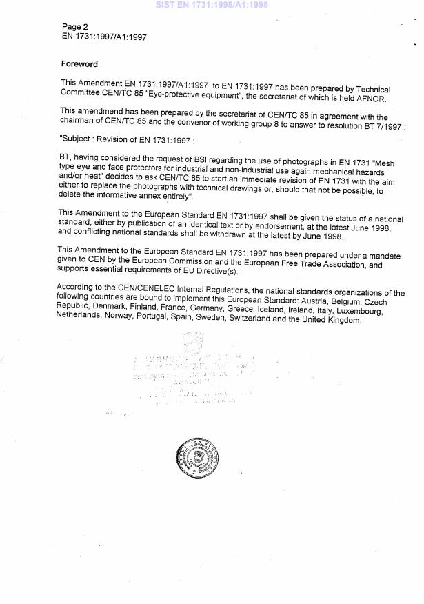 EN 1731:1997/A1:1997 is a amendment published by the European Committee for Standardization (CEN). Its full title is "Mesh type eye and face protectors for industrial and non-industrial use against mechanical hazards and/or heat". This standard covers: Mesh type eye and face protectors for industrial and non-industrial use against mechanical hazards and/or heat