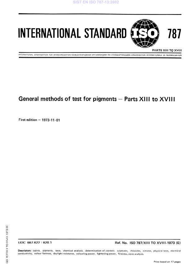 EN ISO 787-13:2001 is a standard published by the European Committee for Standardization (CEN). Its full title is "General methods of test for pigments - Part 13: Determination of water-soluble sulphates, chlorides and nitrates (ISO 787-13:1973)". This standard covers: This part of ISO 787 specifies a general method for determining the electrical conductivity and resistivity of an aqueous extract of a pigment or extender. The method is applicable to all pigments and extenders, except pigments that are substantially soluble in water.