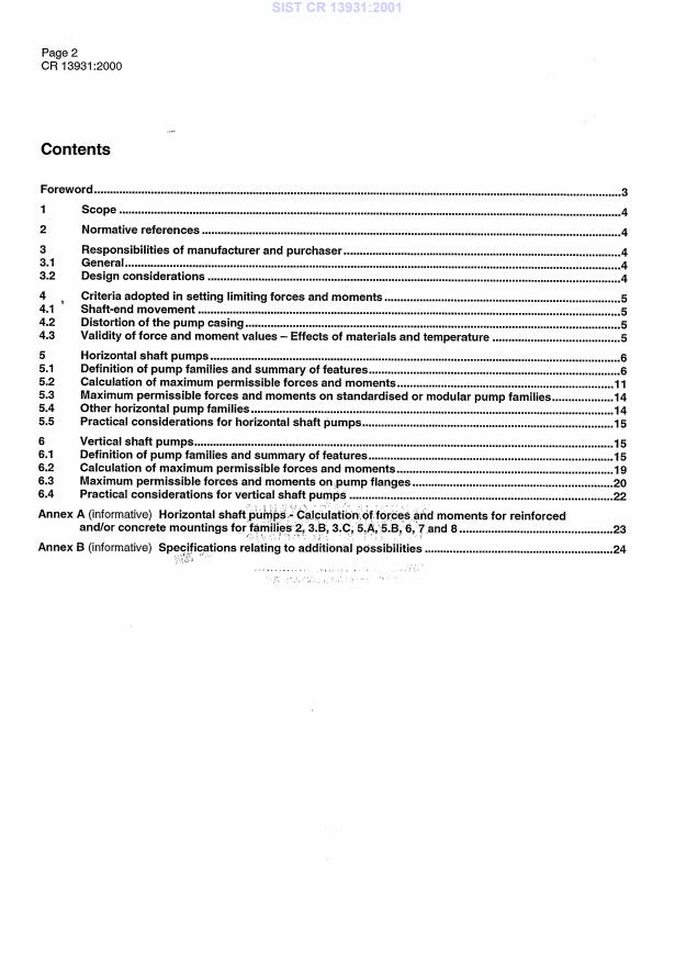 CR 13931:2000 is a standardization document published by the European Committee for Standardization (CEN). Its full title is "Rotodynamic pumps - Forces and moments on flanges centrifugal, mixed flow and axial flow pumps - Horizontal and vertical shafts". This standard covers: This CEN report provides informations for the calculation of maximum permissible forces and moments allowed on the flanges of various types of horizontal and vertical shaft rotodynamic pumps, caused by the reaction to pipework which is rigidly connected to the installation. This document does not take into account the effect of any elastic or deformable linkages, such as bellows, elastic joints, self butting sliding joints etc. This CEN report is not applicable to multistage monobloc pumps, whose outlets are remote from the installation plane, or to horizontal shaft pumps mounted vertically for installation reasons, such as, fixing to a vertical wall.