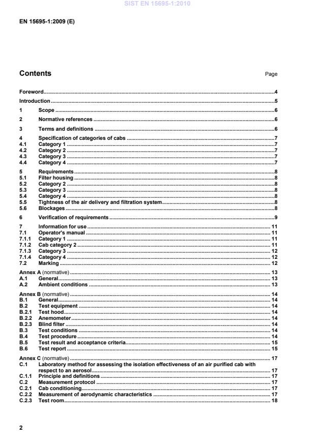 5.4.3 The air flow rate of filtered fresh air shall comply with 5.2.3. 5.5 Tightness of the air delivery and filtration system The air delivery and filtration system and the housing of the filter of cab categories 3 and 4 shall be tested according to Annex B or C. 5.6 Blockages The air delivery and filtration system shall include means to minimize blockages. The operator's manual shall include information on service intervals (as given in 7.1). SIST EN 15695-1:2010