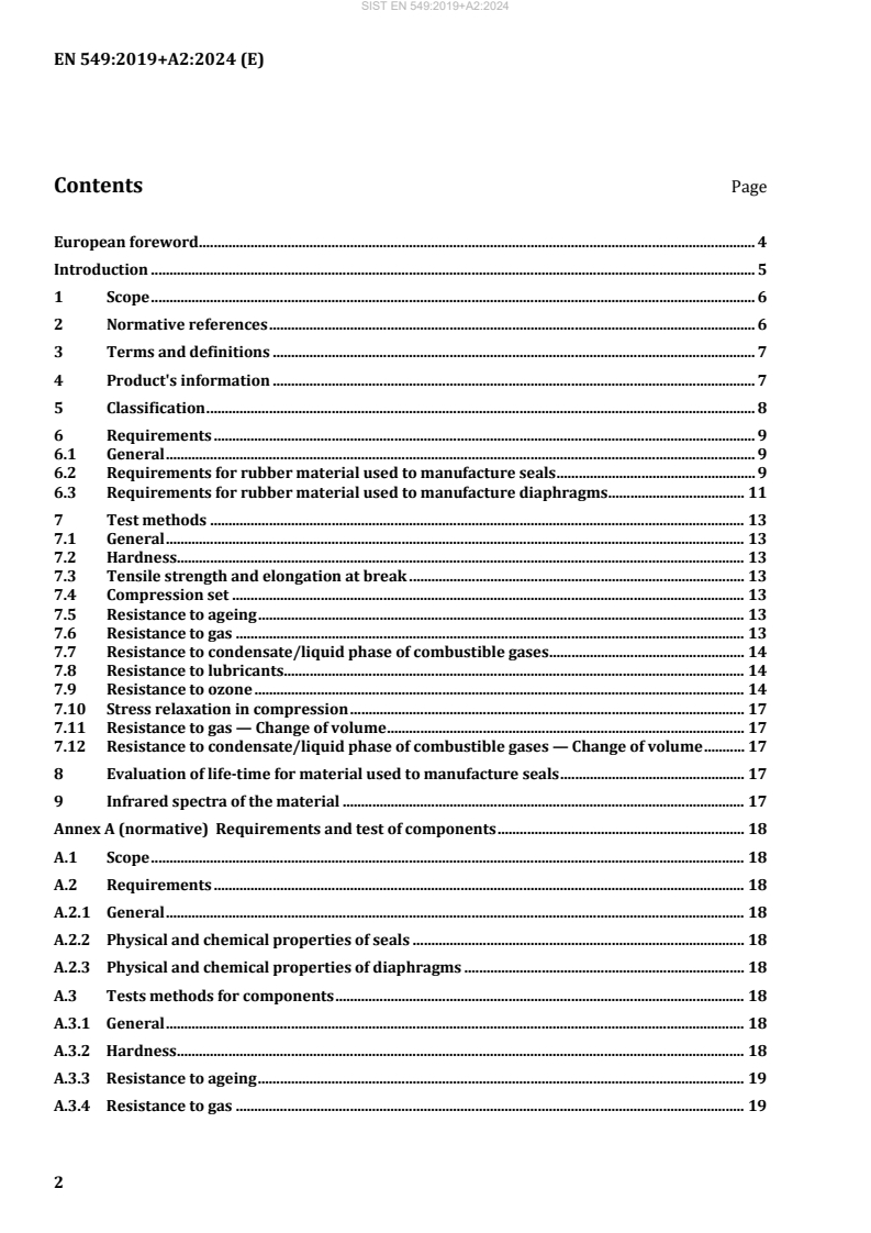 EN 549:2019+A2:2024 is a standard published by the European Committee for Standardization (CEN). Its full title is "Rubber materials for seals and diaphragms for gas appliances and gas equipment". This standard covers: This document specifies requirements and associated test methods for rubber materials used in gas installations, gas equipment and gas appliances in contact with 1st, 2nd and 3rd family combustible gases as classified in EN 437:2018, additionally LPG, bio methane and bio LPG, in the same quality, are covered. It also establishes a classification based on temperature range and hardness. This document is applicable to materials from which homogeneous seals and homogeneous or reinforced diaphragms are manufactured. Since the dimensions and shape of the components differ from those of standard test pieces taken from sheet material as used for type testing of the rubber materials according to this document, tolerances have been made in the requirements specified by Annex A for the components with respect to those specified for standard test pieces. The range of operating temperatures covered by this document is –40 °C to +150 °C. For applications with potential condensation, this document is not applicable for silicon rubber, e.g. above 200 hPa (200 mbar) nominal pressure or at temperatures below 0 °C with 3rd family gases.