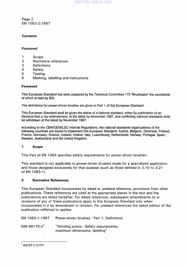 EN 1083-2:1997 is a standard published by the European Committee for Standardization (CEN). Its full title is "Power-driven brushes - Part 2: Safety requirements". This standard covers: This Part of this European Standard specifies safety requirements for power- driven brushes. Excluded from this standard are power-driven brushes made for a specialized application and designed exclusively for that purpose (such as those given in 3.10 to 3.21 prEN 1083-1).