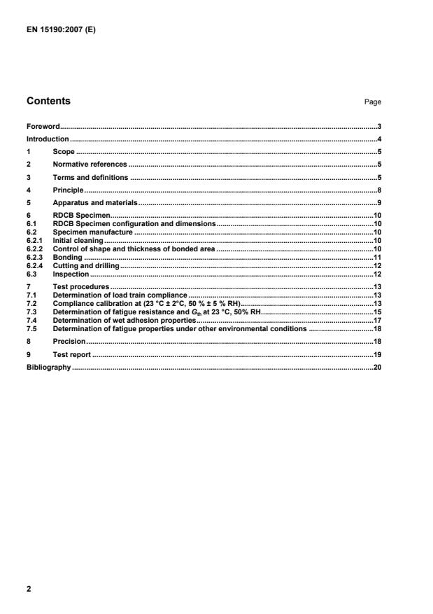 EN 15190:2007 is a standard published by the European Committee for Standardization (CEN). Its full title is "Structural adhesives - Test methods for assessing long term durability of bonded metallic structures". This standard covers: 1.1 This standard specifies test procedures for determining the long-term durability of an adhesive system subjected to environmental and fatigue loads. The procedures are based upon measurement of the crack growth rate and the resistance to crack propagation through the adhesive layer in double cantilever beam type specimens under an applied mode I opening cycling loading. 1.2 The test specimens consist of rectangular metal substrates bonded together with a pre-starter crack in the bondline. For testing joints consisting of relatively thin sheets of metallic substrates the specimen needs to be structurally reinforced by adding layers of compatible material to the back of each adherend substrate in order to prevent permanent deformation, usually referred to as reinforced double cantilever beam (RDCB) test specimen. 1.3 For brevity, the standard relates to testing RDCB specimens, which are essentially more complex in manufacturing than standard double cantilever beam (DCB) specimens. However, the standard allows also for use of single substrate double cantilever beam specimens when the substrate material is available in sufficient thickness. 1.4 The test method has been proven to be particularly sensitive in finding weaknesses within certain adhesive systems and is recommended as a scientific tool to study adhesion properties. This test method may be used to determine: - The fatigue crack growth rate as a function of the mode I strain energy release rate; - The threshold values for negligible crack growth; - The effects of other environmental factors (temperature and/or humidity cycling); - The mode I (peel or crack opening) failure mode of the adhesive joint (cohesive, interfacial, near-surface …).