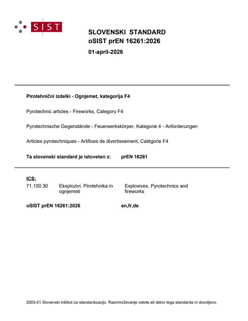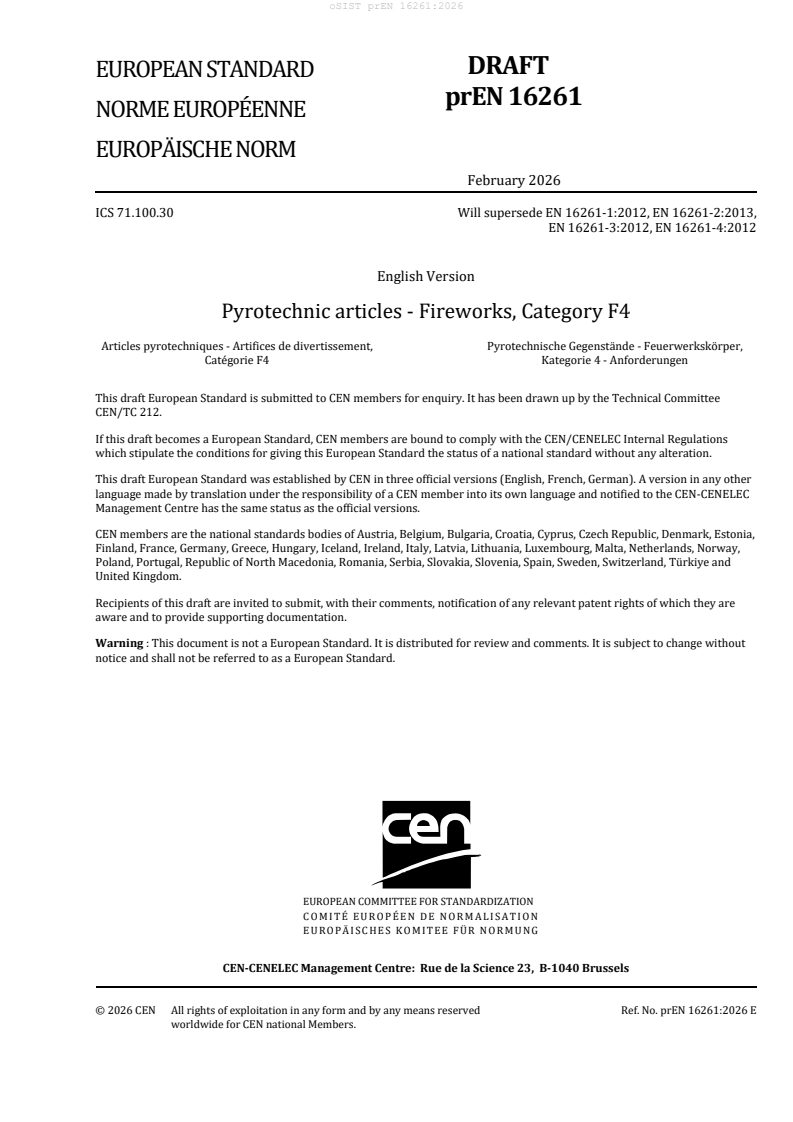 prEN 16261:2026 is a draft European Standard developed by CEN/TC 212 for Category F4 fireworks. It specifies robust requirements for the design, construction, performance, protective packaging, and labelling of professional pyrotechnic articles falling under Category F4. Intended for use by professionals, F4 fireworks are not suitable for public sale and are distinguished by their potential for serious hazards.