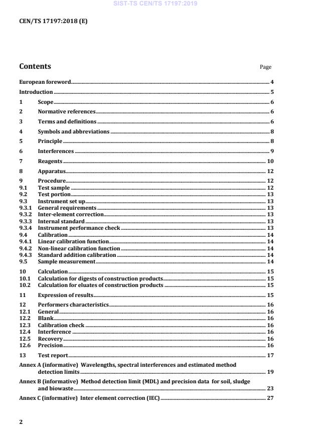 CEN/TS 17197:2018 is a technical specification published by the European Committee for Standardization (CEN). Its full title is "Construction products: Assessment of release of dangerous substances - Analysis of inorganic substances in digests and eluates - Analysis by Inductively Coupled Plasma - Optical Emission Spectrometry (ICP-OES)". This standard covers: This Technical Specification specifies the method for the determination of major, minor and trace elements in aqua regia and nitric acid digests and in eluates of construction products by Inductively Coupled Plasma - Optical Emission Spectrometry (ICP-OES). It refers to the following 44 elements: Aluminium (Al), antimony (Sb), arsenic (As), barium (Ba), beryllium (Be), bismuth (Bi), boron (B), cadmium (Cd), calcium (Ca), cerium (Ce), chromium (Cr), cobalt (Co), copper (Cu), iron (Fe), lanthanum (La), lead (Pb), lithium (Li), magnesium (Mg), manganese (Mn), mercury (Hg), molybdenum (Mo), neodymium (Nd), nickel (Ni), phosphorus (P), potassium (K), praseodymium (Pr), samarium (Sm), scandium (Sc), selenium (Se), silicon (Si), silver (Ag), sodium (Na), strontium (Sr), sulphur (S), tellurium (Te), thallium (Tl), thorium (Th), tin (Sn), titanium (Ti), tungsten (W), uranium (U), vanadium (V), zinc (Zn), and zirconium (Zr). For the determination of low levels of As, Se and Sb, hydride generation may be applied. This method is described in Annex D. NOTE Construction products include e.g. mineral-based products (S); bituminous products (B); metals (M); wood-based products (W); plastics and rubbers (P); sealants and adhesives (A); paints and coatings (C), see also CEN/TR 16045 [1]. The method in this Technical Specification is applicable to construction products and validated for the product types listed in Annex D.