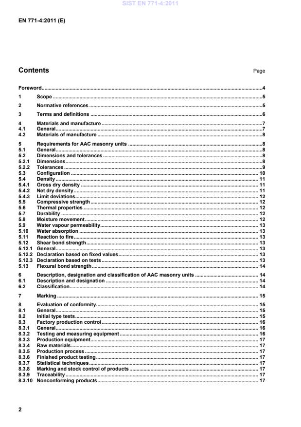 EN 771-4:2011 is a standard published by the European Committee for Standardization (CEN). Its full title is "Specification for masonry units - Part 4: Autoclaved aerated concrete masonry units". This standard covers: This European Standard specifies the characteristics and performance requirements of autoclaved aerated concrete (AAC) masonry units for which the main intended uses are different types of load bearing and non-load bearing applications in all forms of walling including single leaf, cavity, partitions, retaining, basement and general use below ground level, including walling for fire protection, thermal insulation, sound insulation and the fabric of chimneys (excluding chimney flue units). It defines the performance related to e.g. strength, density, dimensional accuracy etc. and provides for the evaluation of conformity of the product to this European Standard. The marking requirement for products covered by this European Standard is included. This European Standard does not cover the requirements for storey height panels, flue linings and masonry units with an incorporated thermal insulation material bonded to the faces of the unit susceptible to be exposed to fire. It does not specify standard sizes for autoclaved aerated concrete units nor standard work dimensions and angles of specially shaped and accessory units. It does not give permissible deviations for specially shaped and accessory units. It does not cover products intended for use as a damp proof course or the lining of a chimney.