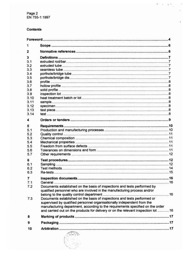 EN 755-1:1997 is a standard published by the European Committee for Standardization (CEN). Its full title is "Aluminium and aluminium alloys - Extruded rod/bar, tube and profiles - Part 1: Technical conditions for inspection and delivery". This standard covers: This part of EN 755 specifies the technical conditions for inspection and delivery of wrought aluminium and aluminium alloy extruded rod/bar, tube and profile for general engineering applications. This specification excludes forging stock, EN AW-6060 / EN AW-6063 extruded precision profiles, and products delivered in coils.