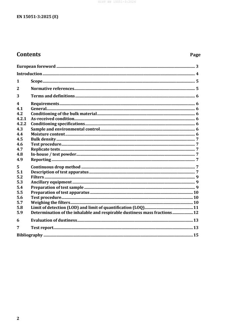EN 15051-3:2025 is a standard published by the European Committee for Standardization (CEN). Its full title is "Workplace exposure - Measurement of the dustiness of bulk materials - Part 3: Continuous drop method". This standard covers: This document specifies the continuous drop test apparatus and associated test method for the reproducible production of dust from a bulk material under standard conditions, and the measurement of the inhalable and respirable dustiness mass fractions, with reference to existing documents, where relevant (see Clause 6). The continuous drop method intends to simulate dust generation processes where there are continuous falling operations (conveying, discharging, filling, refilling, weighing, sacking, metering, loading, unloading etc.) and where dust is liberated by winnowing during falling. It can be modified to measure the thoracic fraction as well, but this modification is not specified in this document. It differs from the rotating drum method presented in EN 15051-2 [4] in that in this document, the bulk material is dropped only once, but continuously, while in EN 15051-2, the same bulk material is repeatedly dropped. Furthermore, this document specifies the environmental conditions, the sample handling and analytical procedures and the method of calculating and presenting the results. A categorization scheme for dustiness is specified, to provide a standardized way to express and communicate the results to users of the bulk materials. This document is applicable to powdered, granular or pelletised bulk materials. This document does not apply to test the dust released when solid bulk materials are mechanically treated (e.g. cut, crushed).