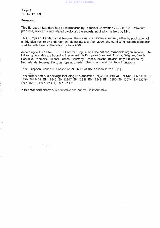 EN 1431:1999 is a standard published by the European Committee for Standardization (CEN). Its full title is "Bitumen and bituminous binders - Determination of recovered binder and oil distillate from bitumen emulsions by distillation". This standard covers: This European Standard specifies a method for the quantitative determination of recovered binder and oil distillate in bitumen emulsions composed principally ofa semisolid or liquid bituminous base, water and an emulsifying agent. The method can be used for quantitative determination of recovered binder and oil distillate in bitumen emulsions for specification acceptance, service evaluation, control and research. The method can also be used to obtain residue and oil distillate for further testing.