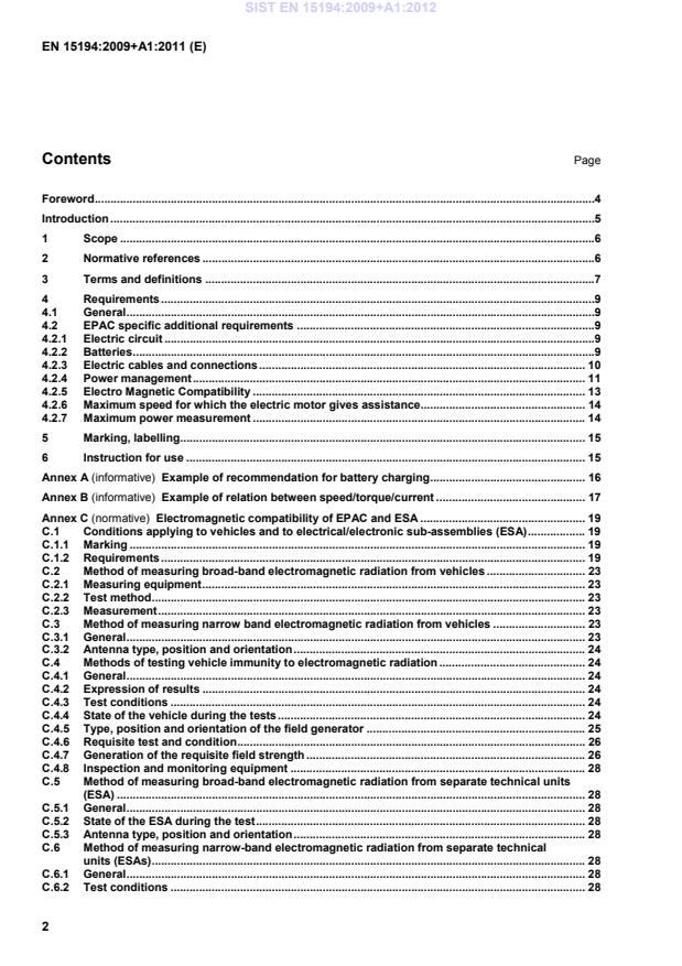 Electromagnetic compatibility of EPAC and ESA . 19C.1 Conditions applying to vehicles and to electrical/electronic sub-assemblies (ESA) . 19C.1.1 Marking . 19C.1.2 Requirements . 19C.2 Method of measuring broad-band electromagnetic radiation from vehicles . 23C.2.1 Measuring equipment . 23C.2.2 Test method . 23C.2.3 Measurement . 23C.3 Method of measuring narrow band electromagnetic radiation from vehicles . 23C.3.1 General . 23C.3.2 Antenna type, position and orientation . 24C.4 Methods of testing vehicle immunity to electromagnetic radiation . 24C.4.1 General . 24C.4.2 Expression of results . 24C.4.3 Test conditions . 24C.4.4 State of the vehicle during the tests . 24C.4.5 Type, position and orientation of the field generator . 25C.4.6 Requisite test and condition . 26C.4.7 Generation of the requisite field strength . 26C.4.8 Inspection and monitoring equipment . 28C.5 Method of measuring broad-band electromagnetic radiation from separate technical units (ESA) . 28C.5.1 General . 28C.5.2 State of the ESA during the test . 28C.5.3 Antenna type, position and orientation . 28C.6 Method of measuring narrow-band electromagnetic radiation from separate technical units (ESAs) . 28C.6.1 General . 28C.6.2 Test conditions . 28SIST EN 15194:2009+A1:2012