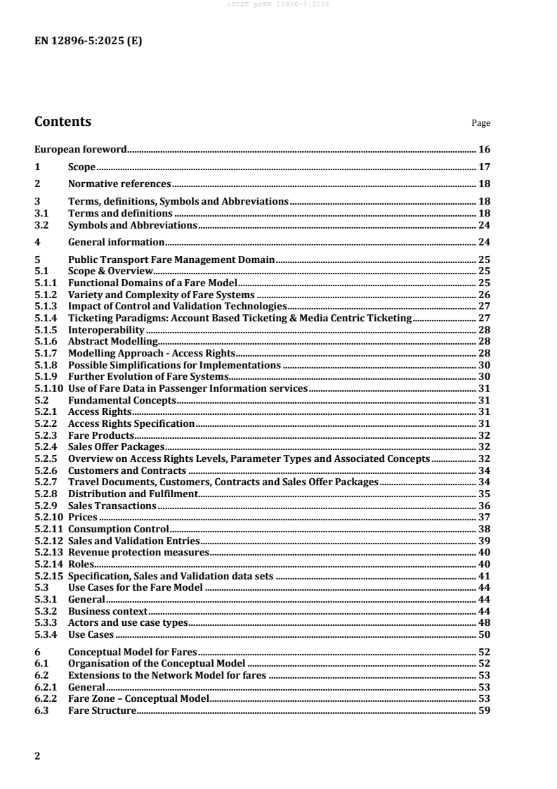 1.1 General Scope of the Standard The main objective of the present standard is to present the Reference Data Model for Public Transport, based on: - the Reference Data Model, EN 12896, known as Transmodel V5.1; - EN 28701:2012, Intelligent transport systems - Public transport - Identification of Fixed Objects in Public Transport (IFOPT), although note that this particular standard has been withdrawn as it is now included within Parts 1 and 2 of this standard (EN 12896-1:2016 and EN 12896-2:2016) following their successful publication. incorporating the requirements of: - EN 15531-1 to -3 and CEN/TS 15531-4 and -5: Public transport - Service interface for real-time information relating to public transport operations (SIRI); - CEN/TS 16614-1 and -2: Public transport - Network and Timetable Exchange (NeTEx), in particular the specific needs for long distance train operation. Particular attention is drawn to the data model structure and methodology: - the data model is described in a modular form in order to facilitate the understanding and the use of the model; - the data model is entirely described in UML. The following functional domains are considered: - Network Description: routes, lines, journey patterns, timing patterns, service patterns, scheduled stop points and stop places; - Timing Information and Vehicle Scheduling (runtimes, vehicle journeys, day type-related vehicle schedules); - Passenger Information (planned and real-time); - Fare Management (fare structure, sales, validation, control); - Operations Monitoring and Control: operating day-related data, vehicle follow-up, control actions; - Driver Management: - Driver Scheduling (day-type related driver schedules), - Rostering (ordering of driver duties into sequences according to some chosen methods), - Driving Personnel Disposition (assignment of logical drivers to physical drivers and recording of driver performance); - Management Information and Statistics (including data dedicated to service performance indicators). The data modules dedicated to cover most functions of the above domains will be specified. Several concepts are shared by the different functional domains. This data domain is called "Common Concepts". 1.2 Functional Domain Description The different functional domains (enumerated above) taken into account in the present standard, and of which the data have been represented as the reference model, are described in EN 12896-1:2016, Public transport - Reference data model - Part 1: Common concepts. 1.3 Particular Scope of this Document The present document entitled Public transport - Reference data model - Part 5: Fare Management addresses Fare Information for Public Transport and incorporates the following data packages: - Fare Structure; - Access Right Assignment; - Fare Pricing; - Sales Description; - Sales Transaction; - Fare Roles; - Validation and Control; - Explicit Frames for Fares. This document itself is composed of the following parts: - Main document (normative) representing the data model for the concepts shared by the different fare domains covered by Transmodel, - Annex A (normative), containing the data dictionary, i.e. the list of all the concepts and attribute tables present in the main document together with the definitions, - Annex B (normative), providing a complement to the "Common Concepts" domain, particularly useful for parts 4 to 8 of the Public Transport Reference Data Model, Annex C (informative), indicating the data model evolutions from previous versions of Transmodel (EN 12896:2006).