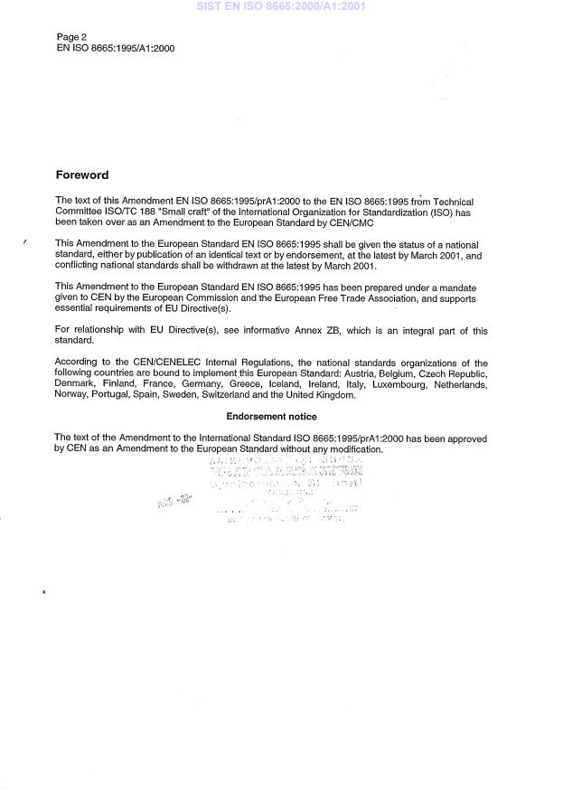 EN ISO 8665:1995/A1:2000 is classified under the following ICS (International Classification for Standards) categories: 47.080 - Small craft. The ICS classification helps identify the subject area and facilitates finding related standards.