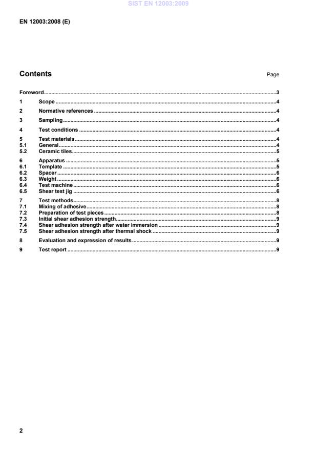 EN 12003:2008 is a standard published by the European Committee for Standardization (CEN). Its full title is "Adhesive for tiles - Determination of shear adhesion strength of reaction resin adhesives". This standard covers: This European Standard specifies the test method to be used to determine the shear adhesion strength of reaction resin ceramic tile adhesives. This European Standard is applicable to all reaction resin ceramic tile adhesives for internal and external tile installations on floors and walls. This European Standard does not contain performance requirements or recommendations for the design and installation of ceramic tiles. NOTE Ceramic tile adhesives can also be used for other kinds of tiles (natural and agglomerated stones, etc.), where these do not adversely affect the stones. This European Standard can involve hazardous materials and operations. Persons using this European Standard should be familiar with normal laboratory practice. This European Standard does not purport to address all the safety problems, if any, associated with its use. It is the responsibility of the user to establish appropriate safety and health practices and to ensure compliance with any European and national regulatory conditions.