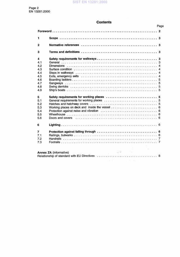 EN 13281:2000 is a standard published by the European Committee for Standardization (CEN). Its full title is "Inland navigation vessels - Safety requirements for walkways and working places". This standard covers: This European Standard specifies the safety requirements for walkways and working places on inland navigation vessels in the areas used for work. Walkways in the passenger area are governed by requirements which are outside the scope of this standard. Requirements related to the marking of safety and health protection are not covered by this standard.