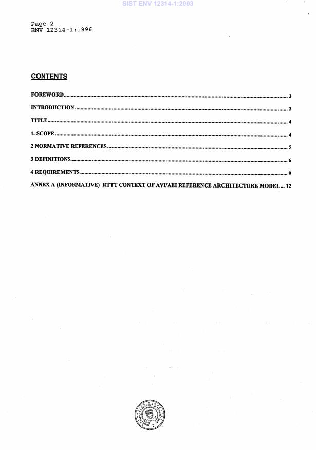 ENV 12314-1:1996 is a standardization document published by the European Committee for Standardization (CEN). Its full title is "Road Transport and Traffic Telematics - Automatic vehicle and equipment identification - Part 1: Reference Architectures and Terminology". This standard covers: This Pre-Standard is to establish a common framework to achieve unambiguous identification in RTTT: AVI/AEI applications.