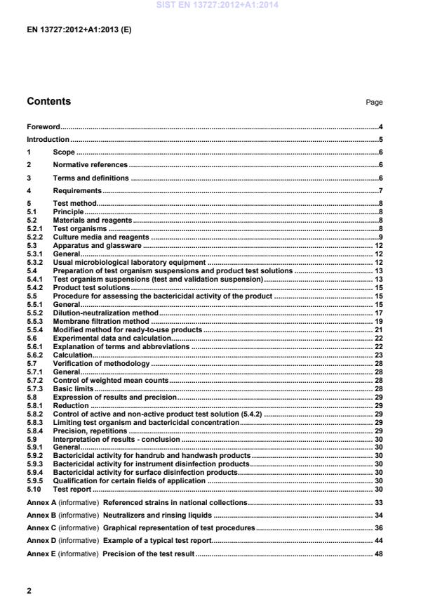 This European Standard applies to products that are used in the medical area in the fields of hygienic handrub, hygienic handwash, surgical handrub, surgical handwash, instrument disinfection by immersion, and surface disinfection by wiping, spraying, flooding or other means. This European Standard applies to areas and situations where disinfection or antisepsis is medically indicated. Such indications occur in patient care, for example: in hospitals, in community medical facilities and in dental institutions; in clinics of schools, of kindergartens and of nursing homes; and may occur in the workplace and in the home. It may also include services such as laundries and kitchens supplying products directly for the patients. NOTE 1 The method described is intended to determine the activity of commercial formulations or active substances under the conditions in which they are used. NOTE 2 This method corresponds to a phase 2 step 1 test. NOTE 3 This method cannot be used to evaluate the activity of products against Legionella in watersystems against mycobacteria and against bacterial spores. EN 14885 specifies in detail the relationship of the various tests to one another and to “use recommendations”. 2 Normative references The following documents, in whole or in part, are normatively referenced in this document and are indispensable for its application. For dated references, only the edition cited applies. For undated references, the latest edition of the referenced document (including any amendments) applies. EN 12353, Chemical disinfectants and antiseptics — Preservation of test organisms used for the determination of bactericidal (including Legionella), mycobactericidal, sporicidal, fungicidal and virucidal (including bacteriophages) activity EN 14885, Chemical disinfectants and antiseptics — Application of European Standards for chemical disinfectants and antiseptics 3 Terms and definitions For the purposes of this document, the terms and definitions given in EN 14885 apply. SIST EN 13727:2012+A1:2014