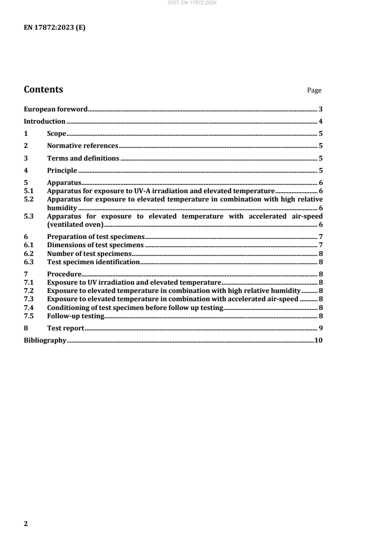 EN 17872:2023 is a standard published by the European Committee for Standardization (CEN). Its full title is "Flexible sheets for waterproofing - Underlays for discontinuous roof coverings - Artificial ageing procedure". This standard covers: This document specifies a procedure for artificial ageing of flexible underlays which are used under discontinuous roof coverings. This is achieved by exposing test samples to UV-radiation, elevated temperature in combination with high relative humidity and elevated temperature in combination with accelerated air-speed.
