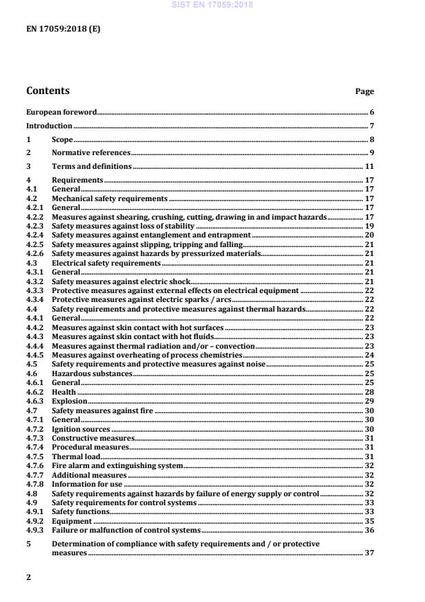 EN 17059:2018 specifies safety requirements and verification methods across multiple technical areas, including: