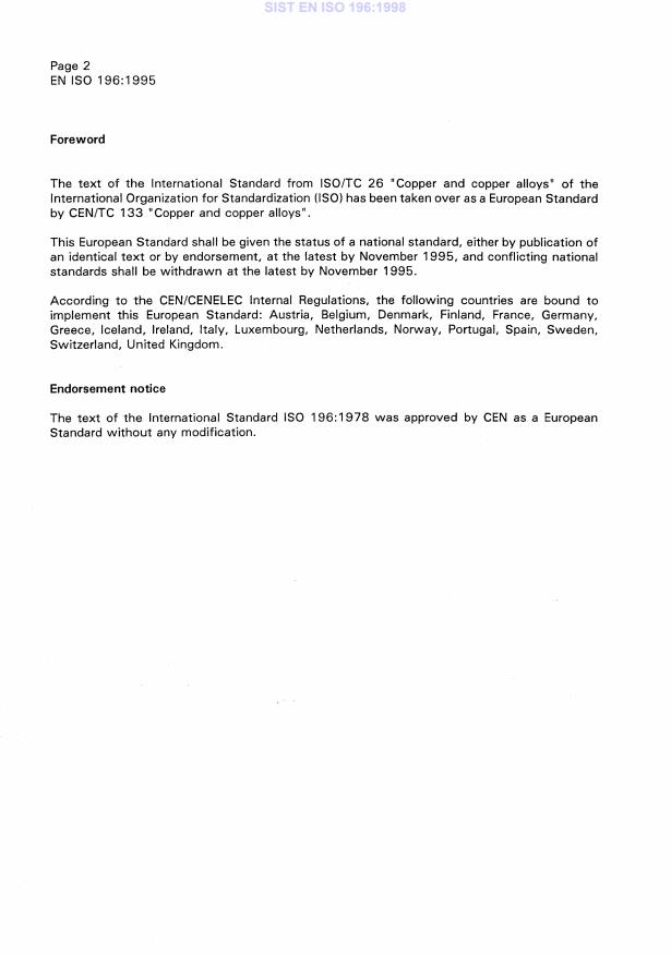 EN ISO 196:1995 is a standard published by the European Committee for Standardization (CEN). Its full title is "Wrought copper and copper alloys - Detection of residual stress - Mercury(I) nitrate test (ISO 196:1978)". This standard covers: Specifies an accelerated test for the purpose of detecting the presence of residual (internal) stresses in wrought copper and copper alloy products that might bring about failure of the material in service or storage through stress corrosion cracking. The method is not intended for testing assemblies and partial assemblies. For such use some modifications may be required.