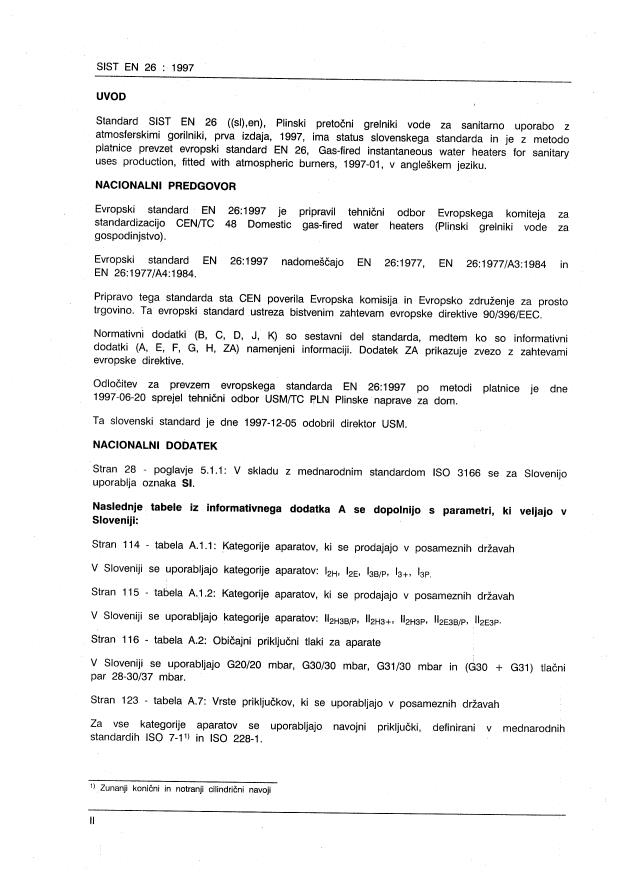 EN 26:1997 is a standard + national annex and/or foreword published by the European Committee for Standardization (CEN). Its full title is "Gas-fired instantaneous water heaters for sanitary uses production, fitted with atmospheric burners (Including Corrigendum 1998)". This standard covers: The object of this standard is to define the classification and the principal constructional and operational characteristics of gas-fired instantaneous water heater for sanitary uses. It covers safety, rational use of energy and fitness for purpose. It applies to instantaneous water heaters for sanitary uses, with a permanent pilot or automatic ignition, with a nominal useful output not exceeding 45 kW and capable of operating with the gases of the various Wobbe number ranges.