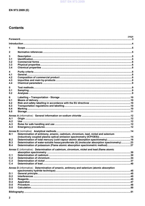Limits in mg/kg of commercial product Arsenic (As) max. 13 Cadmium (Cd) max. 1,3 Chromium (Cr) max. 13 Mercury (Hg) max. 0,26 Nickel (Ni) max. 13 Lead (Pb) max. 13 Antimony (Sb) max. 2,6 Selenium (Se) max. 2,6 NOTE Other chemical parameters and indicator parameters as listed in EU Directive 98/83/EC (see [1]) are not relevant in sodium chloride. 5 Test methods 5.1 Sampling A test sample of about 500 g shall be taken for analysis, ensuring that it is representative of the whole batch, and taking account of ISO 3165 and also ISO 6206. Prepare the laboratory sample(s) required in accordance with ISO 8213. NOTE It should be ensured that no trace of the impurities to be determined is introduced in the sample during the sampling operations. 5.2 Analyses 5.2.1 Main product The percentage mass fraction of sodium chloride (NaCI) shall be determined by calculation, on the basis of the results of the determinations of sulfate (according to ISO 2480), halogens (according to ISO 6227), calcium and magnesium (according to ISO 2482), potassium (see B.4) and loss of mass on drying (according to ISO 2483). Convert sulfate to calcium sulfate and unused calcium to calcium chloride, unless sulfate in sample exceeds the amount necessary to combine with calcium, in which case convert calcium to calcium sulfate and unused sulfate to magnesium sulfate and the remaining sulfate to sodium sulfate. Convert unused magnesium to magnesium chloride. Convert potassium to potassium chloride. Convert unused halogens to sodium chloride. Report the sodium chloride contents on a dry matter basis, multiplying the percentage of sodium chloride by 100/(100 - P), where P is the percentage mass fraction of the loss of mass on drying (see 5.2.2.2). SIST EN 973:2009
