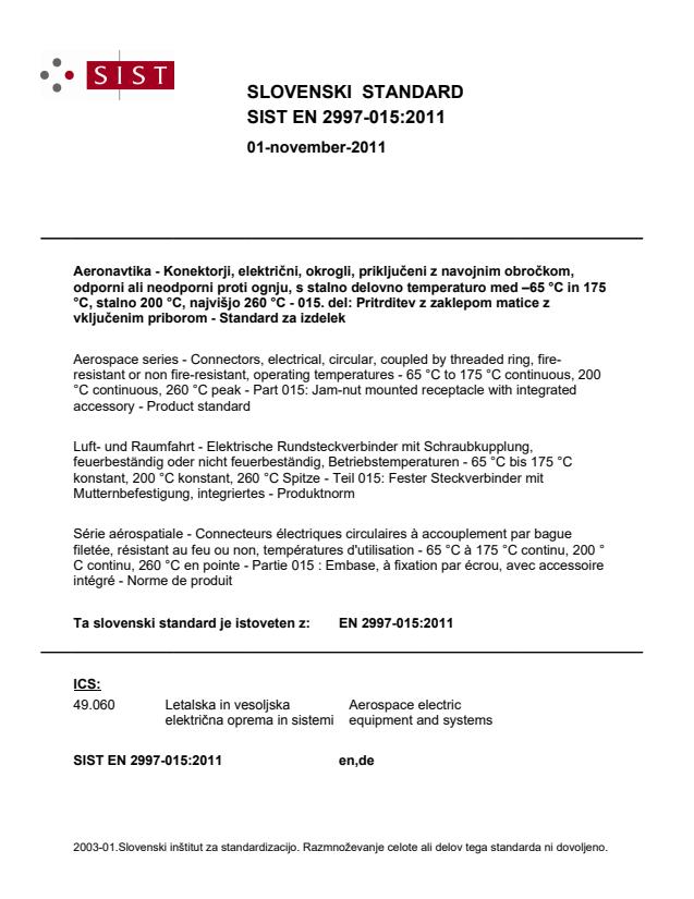 2003-01.Slovenski inštitut za standardizacijo. Razmnoževanje celote ali delov tega standarda ni dovoljeno.Luft- und Raumfahrt - Elektrische Rundsteckverbinder mit Schraubkupplung, feuerbeständig oder nicht feuerbeständig, Betriebstemperaturen - 65 °C bis 175 °C konstant, 200 °C konstant, 260 °C Spitze - Teil 015: Fester Steckverbinder mit Mutternbefestigung, integriertes - ProduktnormSérie aérospatiale - Connecteurs électriques circulaires à accouplement par bague filetée, résistant au feu ou non, températures d'utilisation - 65 °C à 175 °C continu, 200 °C continu, 260 °C en pointe - Partie 015 : Embase, à fixation par écrou, avec accessoire intégré - Norme de produitAerospace series - Connectors, electrical, circular, coupled by threaded ring, fire-resistant or non fire-resistant, operating temperatures - 65 °C to 175 °C continuous, 200 °C continuous, 260 °C peak - Part 015: Jam-nut mounted receptacle with integrated accessory - Product standard49.060Aerospace electric equipment and systemsICS:Ta slovenski standard je istoveten z:EN 2997-015:2011SIST EN 2997-015:2011en,de01-november-2011SIST EN 2997-015:2011SLOVENSKI