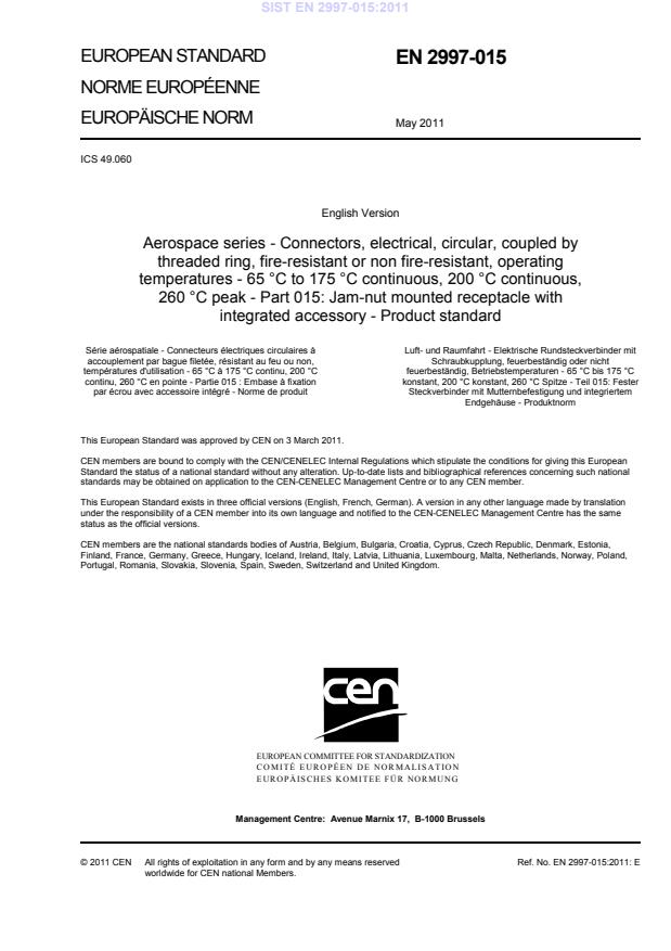 Luft- und Raumfahrt - Elektrische Rundsteckverbinder mit Schraubkupplung, feuerbeständig oder nicht feuerbeständig, Betriebstemperaturen - 65 °C bis 175 °C konstant, 200 °C konstant, 260 °C Spitze -Teil 015: Fester Steckverbinder mit Mutternbefestigung und integriertem Endgehäuse - Produktnorm This European Standard was approved by CEN on 3 March 2011.