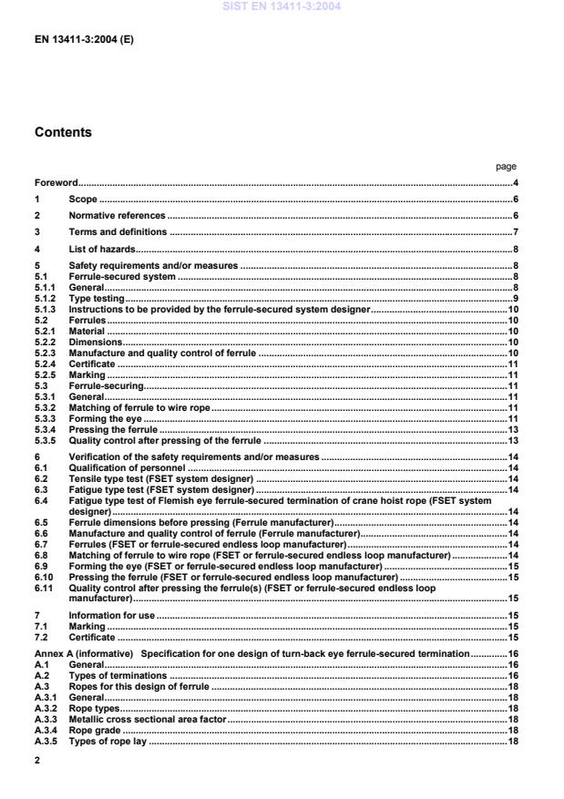 EN 13411-3:2004 is a standard published by the European Committee for Standardization (CEN). Its full title is "Terminations for steel wire ropes - Safety - Part 3: Ferrules and ferrule-securing". This standard covers: This European Standard deals with the requirements for the ferrule-securing of eyes and endless loops. It also deals with the requirements for ferrules for the ferrule-securing of eyes and endless loops. This European Standard applies to the ferrule-securing of eye terminations formed either by a Flemish eye or turn-back eye and covers ferrules made of non alloy carbon steel, stainless steel, aluminium and copper. This European Standard applies to slings and assemblies using steel wire ropes for general lifting applications up to and including 60mm diameter conforming to EN 12385-4, lift ropes conforming to EN 12385-5 and spiral strand ropes conforming to EN 12385-10. Type testing of ferrule-secured systems and manufacturing quality control requirements are also specified. This European standard deals with all significant hazards, hazardous situations and events relevant to this particular steel wire rope termination when used as intended and under conditions of use which are foreseeable by the manufacturer. This standard applies to terminations of steel wire ropes with ferrules and ferrule-securing which are manufactured after the date of this publication. NOTE One design of ferrule-secured turn-back eye termination using an oval aluminium ferule which satisfies the requirements of this European Standard is given for information in annex A.
