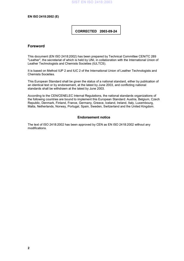 2003-09-24ForewordThis document (EN ISO 2418:2002) has been prepared by Technical Committee CEN/TC 289"Leather", the secretariat of which is held by UNI, in collaboration with the International Union ofLeather Technologists and Chemists Societies (IULTCS).It is based on Method IUP 2 and IUC 2 of the International Union of Leather Technologists andChemists Societies.This European Standard shall be given the status of a national standard, either by publication ofan identical text or by endorsement, at the latest by June 2003, and conflicting nationalstandards shall be withdrawn at the latest by June 2003.According to the CEN/CENELEC Internal Regulations, the national standards organizations ofthe following countries are bound to implement this European Standard: Austria, Belgium, CzechRepublic, Denmark, Finland, France, Germany, Greece, Iceland, Ireland, Italy, Luxembourg,Malta, Netherlands, Norway, Portugal, Spain, Sweden, Switzerland and the United Kingdom.Endorsement noticeThe text of ISO 2418:2002 has been approved by CEN as EN ISO 2418:2002 without anymodifications.SIST EN ISO 2418:2003