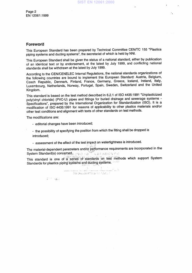 EN 12061:1999 is a standard published by the European Committee for Standardization (CEN). Its full title is "Plastics piping systems - Thermoplastics fittings - Test method for impact resistance". This standard covers: This standard specifies a method for testing the impact strength of fittings by dropping them onto a rigid surface. For a fitting with seal retaining components, such as seal retaining caps or rings, the method includes assessment of the watertightness of the fittings when the fixing elements show disturbance as a result of the test. This standard is applicable to fittings made from thermoplastics materials intended to be used for buried and above ground applications.