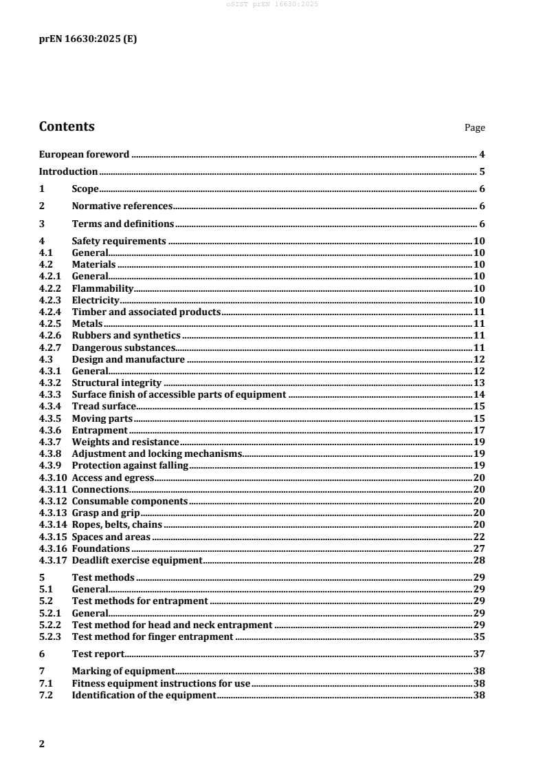 The prEN 16630:2025 standard, developed by CEN Technical Committee CEN/TC 136, defines general safety requirements and test methods for permanently installed outdoor fitness equipment. This standard applies to fitness equipment designed for youths and adults with an overall height above 1,400 mm, aiming to support physical fitness through outdoor exercise. It excludes electrically powered devices, functional training systems with free weights, and military-style obstacle courses with restricted access.