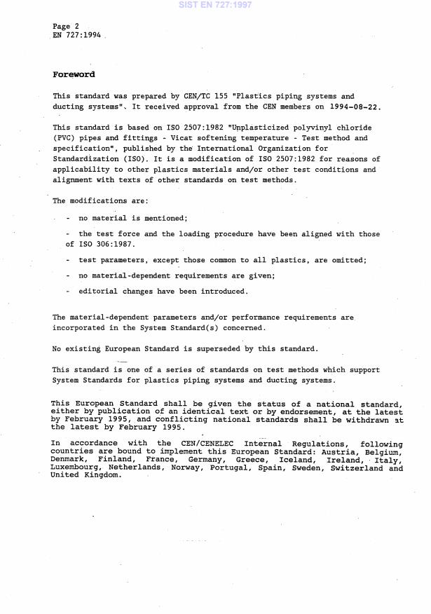 EN 727:1994 is a standard published by the European Committee for Standardization (CEN). Its full title is "Plastics piping and ducting systems - Thermoplastics pipes and fittings - Determination of Vicat softening temperature (VST)". This standard covers: This standard specifies a method for determining the Vicat softening temperature (VST) of pipes and fittings (see note) of thermoplastics materials, based on method B of ISO 306:1987, i.e. using a force of (50-1) N and a rate of temperature increase of 50°C/h. A measure of the temperature is obtainable only for those thermoplastics for which the softening becomes rapid.