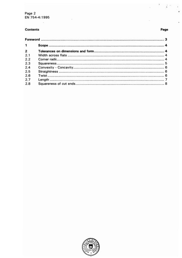 EN 754-4:1995 is a standard published by the European Committee for Standardization (CEN). Its full title is "Aluminium and aluminium alloys - Cold drawn rod/bar and tube - Part 4: Square bars, tolerances on dimensions and form". This standard covers: This part of EN 754 specifies the tolerances on dimensions and form for aluminium and aluminium alloy cold drawn square bars having widths across flats from 3 mm up to 100 mm.