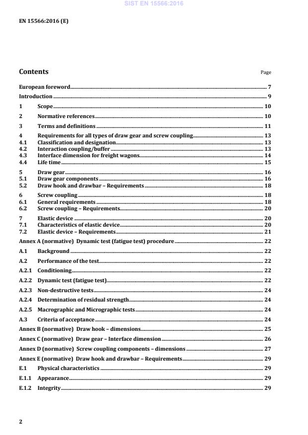 EN 15566:2016 is a standard published by the European Committee for Standardization (CEN). Its full title is "Railway applications - Railway rolling stock - Draw gear and screw coupling". This standard covers: This standard specifies the requirements for the draw gear and screw coupling for the end of rolling stock that has to couple with other rolling stock (freight wagons, locomotives, passenger vehicles ...). This standard covers the functionality, construction, interfaces and testing including pass/fail criteria for draw gear and screw coupling. The standard describes three categories of classification of draw gear and screw coupling, (1 MN, 1,2 MN and 1,5 MN). Permanent coupling systems are not in the scope of this standard.