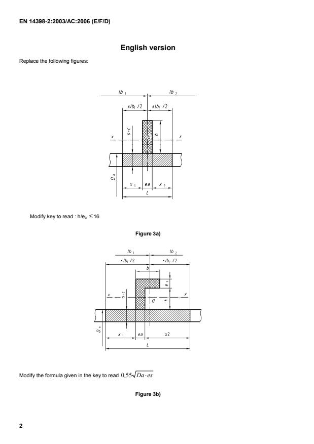 B-1050 Brussels© 2006 CENAll rights of exploitation in any form and by any means reserved worldwide for CEN national Members.Tous droits d'exploitation sous quelque forme et de quelque manière que ce soit réservés dans le monde entier auxmembres nationaux du CEN.Alle Rechte der Verwertung, gleich in welcher Form und in welchem Verfahren, sind weltweit den nationalen Mitgliedernvon CEN vorbehalten.Ref. No.:EN 14398-2:2003/AC:2006 D/E/F