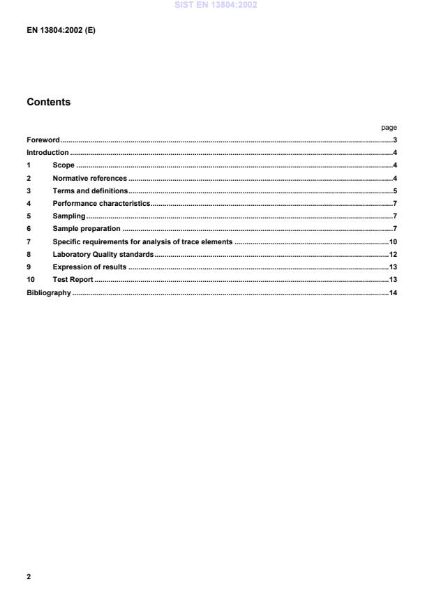 EN 13804:2002 is a standard published by the European Committee for Standardization (CEN). Its full title is "Foodstuffs - Determination of trace elements - Performance criteria, general considerations and sample preparation". This standard covers: This European Standard specifies performance criteria for the selection of methods of analysis of trace elements in foodstuffs. It provides general considerations about the special requirements on sample preparation, apparatus, equipment and reagents for trace elements analysis. In selecting a method of analysis for a specific food matrix, the analyst should give preference to any method which has been developed by the appropriate vertical Technical Committee rather than using a method which has been developed by the horizontal Technical Committee CEN/TC 275/WG 10. However it is the responsibility of the ana-lyst to determine whether an applicable vertical standard has been published.