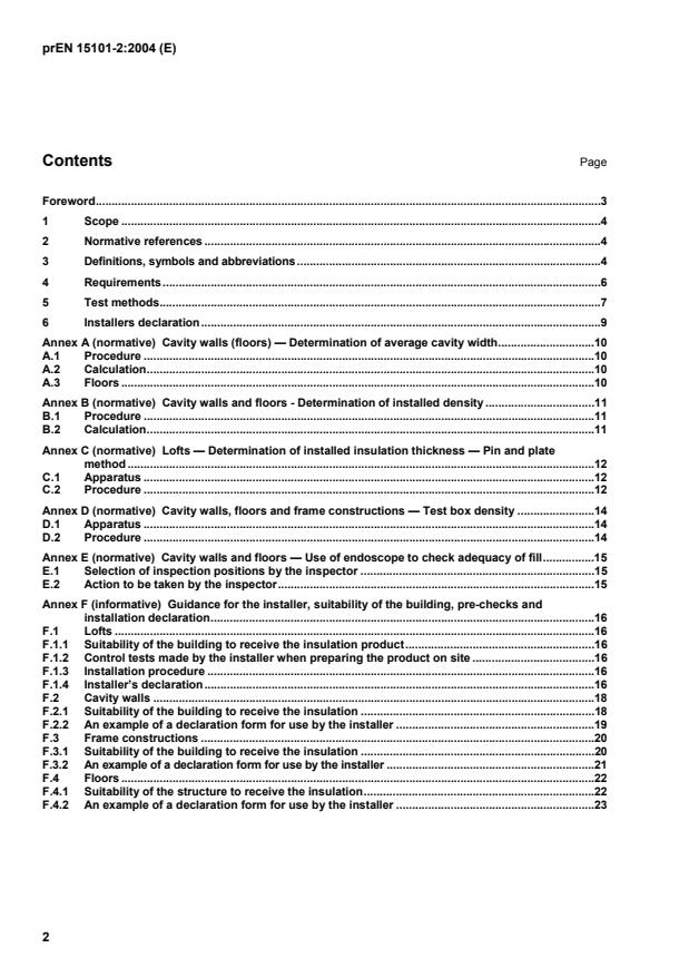 FprEN 15101-2 is a draft published by the European Committee for Standardization (CEN). Its full title is "Thermal insulation products for buildings - In-situ formed loose fill cellulose (LFCI) products - Part 2: Specification for the installed products". This standard covers: This European Standard specifies requirements for in-situ formed loose-fill cellulose insulation (LFCI) products when installed as thermal insulation in internal walls, external walls, floors, galleries, roofs and ceilings. This Part 2 is a specification for the installed product. Part 2 also specifies the checks and tests to be used for the declarations made by the installer of the product. This European Standard does not specify the required level of all properties to be achieved by a product to demonstrate fitness for purpose in a particular application. The required levels are to be found in regulations or non-conflicting standards. Products with a declared thermal conductivity at 10 °C (mean temperature) greater than 0,060 W/(m × K) or a declared thermal resistance lower than 0,25 m2 × K/W are not covered by this European Standard. This European Standard does not cover factory made cellulose mats, bats or quilts intended to be used for the insulation of buildings or in-situ cellulose products for the insulation of building equipment and industrial installations. Nor does it specify performance requirements.
