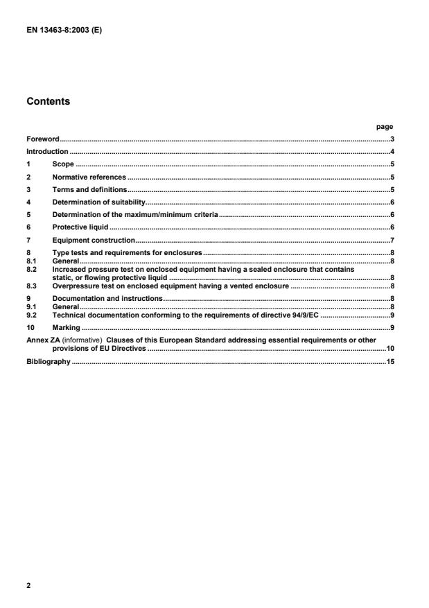 EN 13463-8:2003 is a standard published by the European Committee for Standardization (CEN). Its full title is "Non-electrical equipment for potentially explosive atmospheres - Part 8: Protection by liquid immersion 'k'". This standard covers: 1.1 This European Standard specifies the requirements for the design, construction, testing and marking of ignition protected equipment using liquid immersion 'k' as a means of preventing potential ignition sources from becoming effective according to the category, or categories, of the equipment to which it is constructed. 1.2 It may be used to provide ignition protection, either as an independent means, in addition to, or in combination with, other types of ignition protection listed in prEN 13463-1 for Group I, categories M1 and M2 and Group II, categories 1G, 1D, 2G, 2D, 3G and 3D equipment, according to the ignition hazard assessment. 1.3 This European Standard supplements the requirements of prEN 13463-1 insofar as it applies to the protection of non-electrical equipment by liquid immersion 'k'. 1.4 This European Standard does not apply to the ignition protection of electrical equipment. For these requirements reference shall be made to EN 50014 and EN 50015, which inter-alia, requires electrically non-conducting protective liquids to be used.